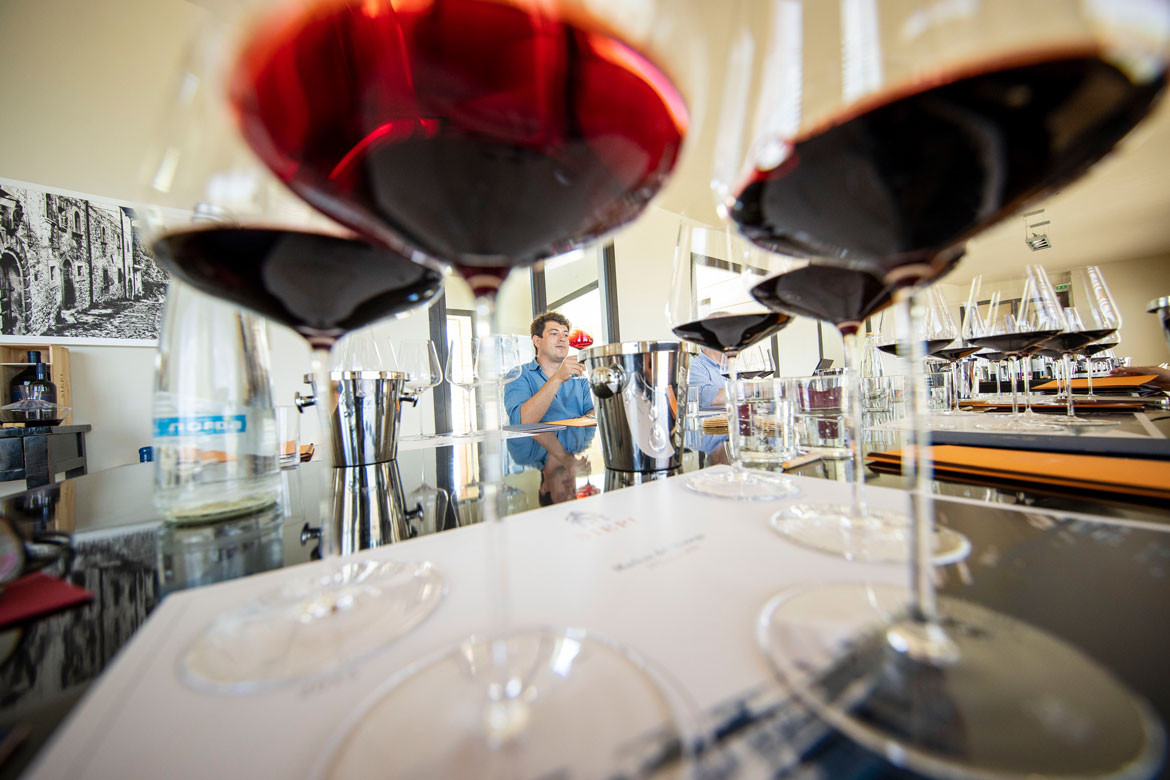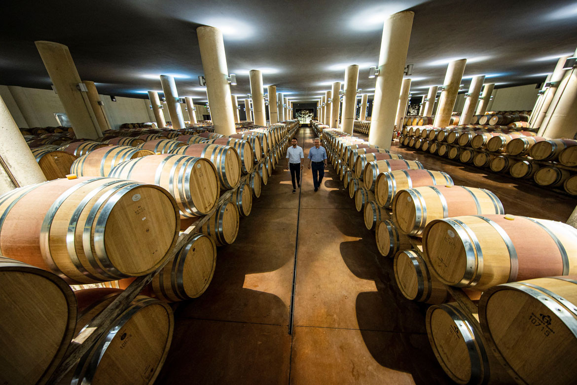 Es war Agnese Mazzei, die dieses architektonische Kleinod in den Hügeln geplant hat und das von Weitem wenig spektakulär wirkt. Doch so-bald man seinen Fuß in das Gebäude setzt, kommt man ins Staunen. Der oberirdische Teil ist nur ein Bruch-teil der Kellerei und wirkt fast wie die Spitze eines Eisbergs. Der Großteil des Gebäudes ist zunächst dem Auge verborgen und auf drei Etagen unterirdisch in den Fels geschlagen. So können die Weine unter der Erde, geschützt vor der heißen toskanischen Sonne, in aller Ruhe reifen. Tausende von Fässern reihen sich aneinander, denn schließlich müssen die begehrten Spitzenweine für längere Zeit im Holzfass ausgebaut werden. In diesem unterirdischen Gewölbe schlägt das wahre Herz des Weinguts. Und doch ist dieses Kunststück der Architektur nur ein kleiner Baustein im Werden von großen Weinen, wie uns Giovanni eindrücklich vor Augen führt.