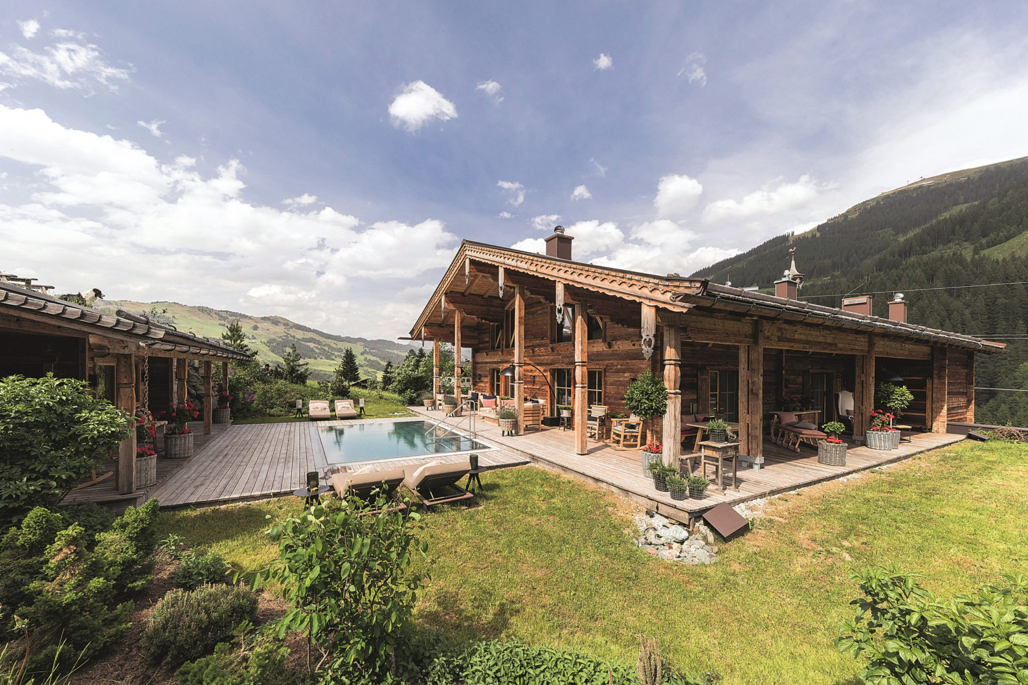 Ursprünglich als ihr eigenes Wohnhaus erbaut, bieten die Hasenauers dort seit 2014 ein Ultra-Luxus-Chalet zur Vermietung an. Bis zu zehn Personen können auf der „Schmiedalm“ auf 370 Quadratmetern alpinen Charme auf edelste Weise genießen. Ein privater Wellness-Bereich mit Sauna und beheiztem Außenpool gehört ebenso dazu wie eine Bauernküche auf Hightech-Niveau, in der auf Wunsch ein Privatkoch den Löffel schwingt. So sieht Hüttenzauber für allerhöchste Ansprüche aus.