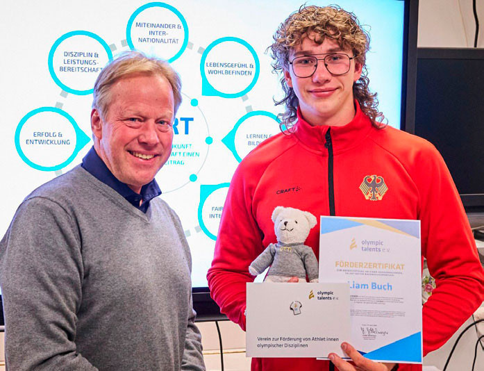 Stefan Settelmayer (Vorstandsvorsitzender Olympic Talents e. V.) und Liam Buch (Nach-wuchstalent „Kanut“)