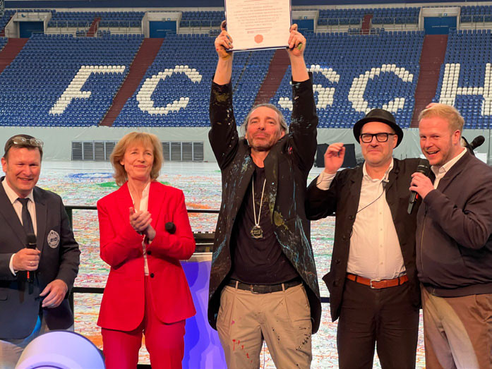 In der Arena auf Schalke finden bemerkenswerte Events statt. Dank des herausfahrbaren Rasens kann der Gelsenkirchener Künstler Christian Nienhaus mit der Unterstützung der TAS Emotional Marketing (Essen) und vielen Helfern hier das größte Bild der Welt für einen Eintrag in das Guinness-Buch der Rekorde malen. Aber wie werden die sagenhaften über 13.000 Quadratmeter zu einem Bild? Darüber machten sich Christian Nienhaus und Thomas Siepmann lange Gedanken. Dann ist es soweit: Beim Empfang der Stadt Gelsenkirchen, wo Oberbürgermeisterin Karin Welge vor rund 600 Gästen über die Fortschritte der bunten Stadt Gelsenkirchen mit ihrem großen Potenzial berichtet, wird dieser Mega-Event gestartet. Sportlerinnen und Sportler aus zwölf Nationen laufen unter der Leitung von Christian Nienhaus mit schweren Farbbeuteln auf dem Rücken historische Spielzüge nach, während die Farben aus den Rucksäcken fließen. So entsteht Zug um Zug das größte Bild der Welt – bunt, kreativ und vielfältig, wie das Ruhrgebiet und seine Menschen. Unglaubliche 8.200 Liter Farbe sind aufgebracht. Christian Nienhaus ist überglücklich, hält die Urkunde hoch und alle feiern mit. Die Überschüsse von Colourful Art of Football gehen an wohltätige Zwecke. Für mich war es etwas Besonderes, prominente Gäste wie Schalke-Chef Matthias Tillmann, die Gelsenkirchener Oberbürgermeisterin, Söhne-Mannheims-Sänger Rolf Stahlhofen und Bundes-Justizminister Marco Buschmann (FDP) persönlich zu treffen. Emotionales Highlight dabei eine Begegnung mit dem Fußball-Helden des Ruhrgebiets, Klaus Fischer. Den Gänsehautmoment der besonderen Art, ein Idol der eigenen Jugend persönlich zu sprechen, werde ich nie vergessen.