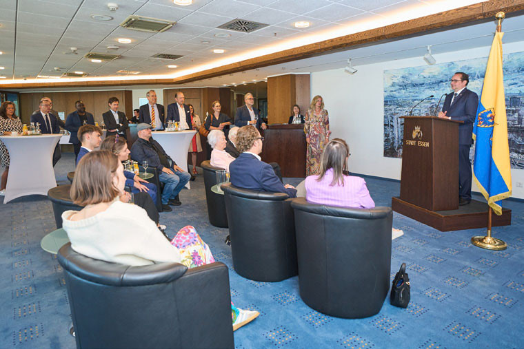 Im Laufe des Vormittags kann ich die Freude und den Stolz, die neben seiner Familie auch seine Freunde und die Mitstreiter*innen empfinden, hautnah miterleben. Im prächtigen Empfangssaal der 22. Etage wird jeder Einzelne von Oberbürgermeister Thomas Kufen begrüßt. Er leitet die Zeremonie mit der Vorlesung der BVK-Urkunde, die Bundespräsident Steinmeier unterzeichnet hatte, ein. Die Würdigung von Tim’s zahlreichen gesellschaftlichen Beiträgen ist beeindruckend. Dabei muss OB Kufen zu Notizen greifen, um die lange Liste seiner Verdienste vollständig darzustellen. Er lässt es sich nicht nehmen, persönliche Worte an Tim und die Gäste einzubauen, da er wohltätige Initiativen nach Kräften unterstützt.