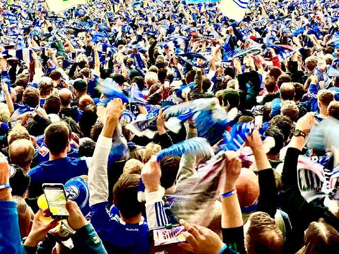 Am Spielfeldrand angekommen, auf die Tribünen und die riesige Anzeigentafel von den Spieler- und Trainersitzen aus hinaufblickend, zeigt sich die imposante Multifunktionsarena mit über 60.000 Plätzen als Veranstaltungsort von globaler Relevanz. Erkennbar auch an den Buchungen von Taylor Swift, die hier eines ihrer drei einzigen Konzerte in Deutschland gegeben hat. Zurück zum Fußball: Aus der Loge des Aufsichtsrates und Vorstandes können wir das Spiel verfolgen. Direkt vor uns liegt der Schalker Fanblock, die berühmte Nordkurve. Mit ihrer bekannten und unvergleichlichen Leidenschaft heizt sie mit rhythmischem Fangesang die Stimmung an und reißt alle Zuschauer mit. Seit 120 Jahren bilden die Fans den 12. Mann auf dem Feld und sind ein besonderes Aushängeschild für den FC Schalke 04.