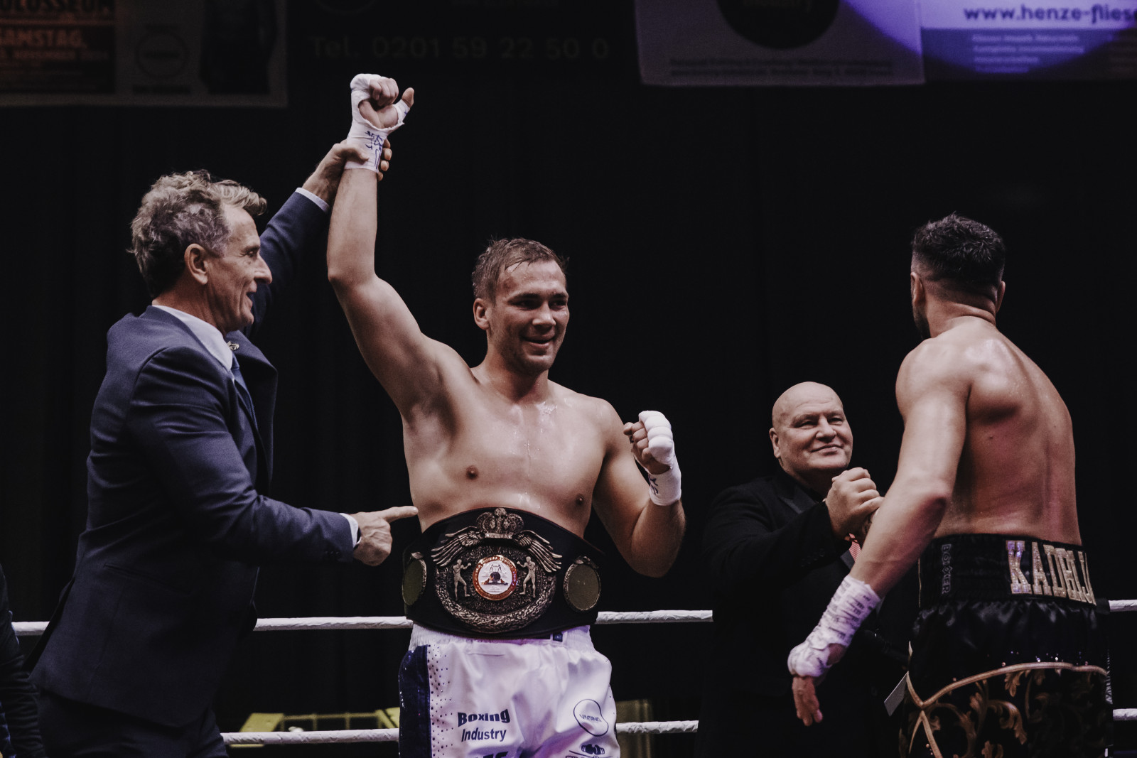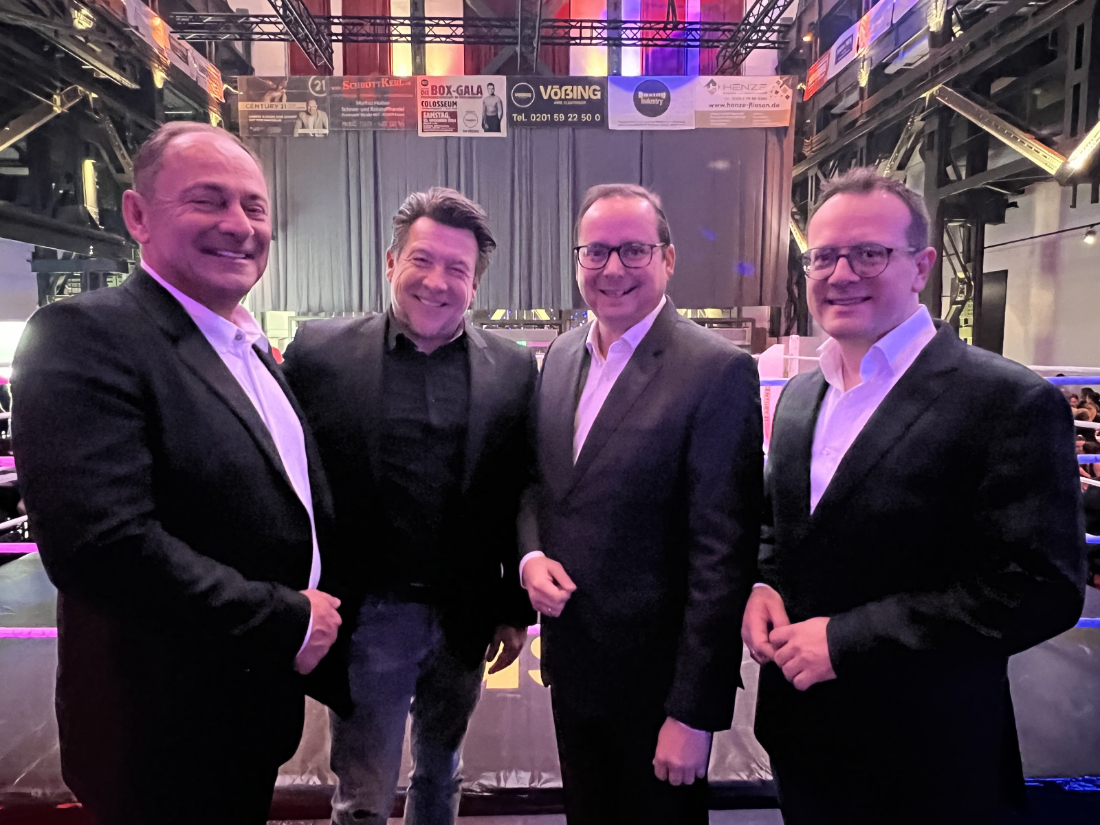Schon oft war ich auf verschiedensten Veranstaltungen im Essener Colosseum, aber noch nie habe ich dort einen Boxkampf gesehen und bin gespannt, wie ein solches Event in dieser traditionsreichen Stätte umgesetzt wird. Über 600 Zuschauer kommen, um den EM-Titelkampf um den WBA-EM-Gürtel zwischen Tim Vößing (27) und Erdogan Kadrija (38), – genannt Big Edi – im Cruisergewicht zu sehen. Der Ring ist zentral aufgebaut und bietet von überall eine gute Sicht. Noch besser aber von der Empore, die durch ihren stufenartigen Aufbau ideale „Draufsicht“ bietet. Hier begrüßt Olaf Vößing, Vater des Titelanwärters, viele persönlich geladene Gäste, die ihm heute gleichzeitig zum Geburtstag gratulieren dürfen. In der darüberliegenden Lounge treffe ich auf den legendären Sven Ottke, der 1998 den WM-Titel des IBF-Verbandes und 2003 auch den WM-Titel des WBA gewann. Auch er ist begeistert von der Atmosphäre im Colosseum und heiß darauf, den Kampf von Tim zu sehen. Während der Vorkämpfe muss ich kurz ums Eck und treffe Tim, noch im Trainingsanzug, kurz vor seiner Aufwärmphase. Zu meiner Verwunderung wirkt er recht entspannt und lässt sich gut gelaunt sogar auf ein Pläuschchen mit mir ein. Er ist zuversichtlich und hochmotiviert, den Kampf zu bestreiten.