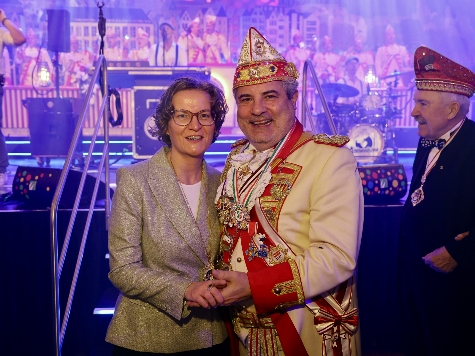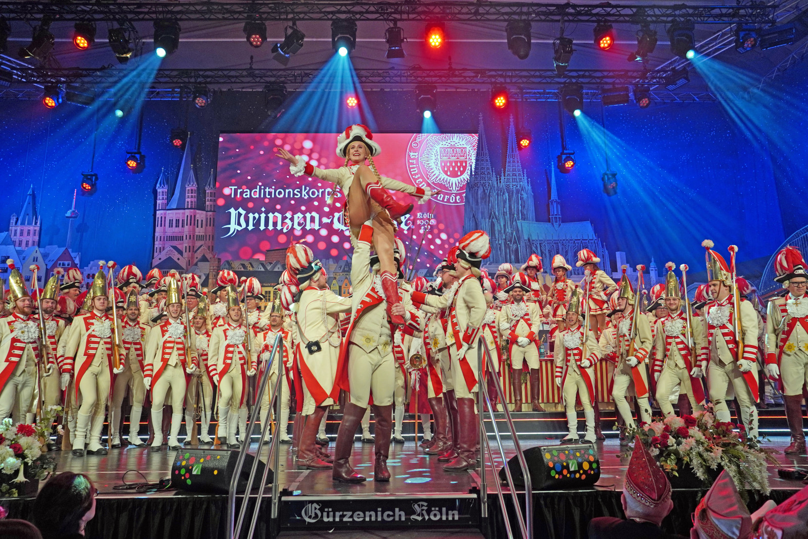 Der große Festsaal ist bis auf den letzten Platz besetzt. Kein Wunder, denn die Liste der Ehrengäste liest sich beeindruckend: Landesministerin Ina Scharrenbach, Fußball-Legende Günter Netzer und Landesregierungssprecher Christian Wiermer sind nur einige der prominenten Gäste, die sich dieses Event nicht entgehen lassen. Punkt 19 Uhr setzt der große Einmarsch der Prinzen-Garde den ersten Glanzpunkt. In perfekter Formation marschieren die Gardisten mit Trommlern, Trompetern, den Wahrzeichenhaltern und den auf den Schultern getragenen Funkenmariechen durch den Saal. Ein nicht enden wollender Strom an Uniformen, Musik und Emotionen – und als krönender Abschluss verteilen die Rosenkavaliere hunderte von Blumen in die begeisterte Menge.