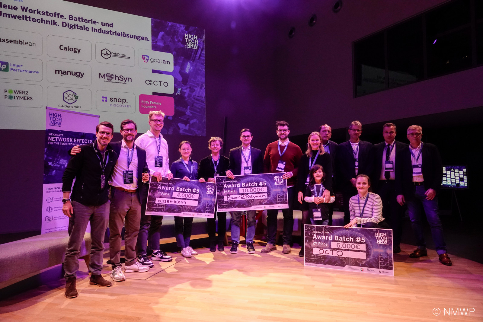 Gebannt von diesen bahnbrechenden Ideen nehme ich wahr, dass die Veranstaltung schon in vollem Gange ist und Investoren, Presse und Vertreter von Konzernen und Politik eintreffen. Paul Höller, der Staatssekretär im Ministerium für Wirtschaft, Industrie, Klimaschutz und Energie von NRW startet einen Rundgang und macht konsequent bei jedem Stand halt. Dabei lässt er sich die Innovationen der Start-ups im Detail erläutern und ist sichtlich beeindruckt. Beim offiziellen Teil werden die Pitches aller Start-ups vor der Expertenjury, die sich aus Fachleuten der Industrie, Wissenschaft und Investoren zusammensetzt, von den Gründer*innen vorgetragen. Es fällt der Jury nicht leicht, aus den starken Vorträgen drei Gewinner auszuwählen. Schließlich ist es soweit und die Preise werden von Frau Dr. Kirsten Bender, Leiterin des Referats Innovation & Märkte im NRW-Wirtschaftsministerium, verliehen.
