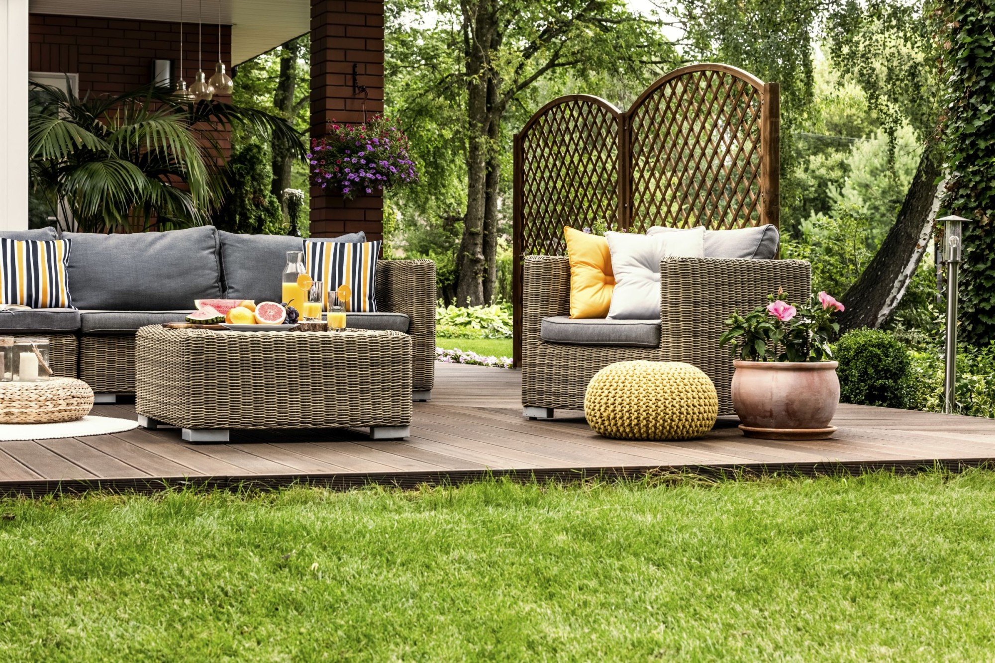 Ein guter Windschutz sorgt dafür, dass die Terrasse selbst an kühleren Tagen gut genutzt werden kann. Außerdem dient er gleichzeitig als Sichtschutz gegenüber der neugierigen Blicke der Nachbarn. Eine Terrassenüberdachung lohnt sich ebenfalls, damit nicht der erste Regentropfen die gemeinsame Gartenparty mit Freunden oder Familie stört.