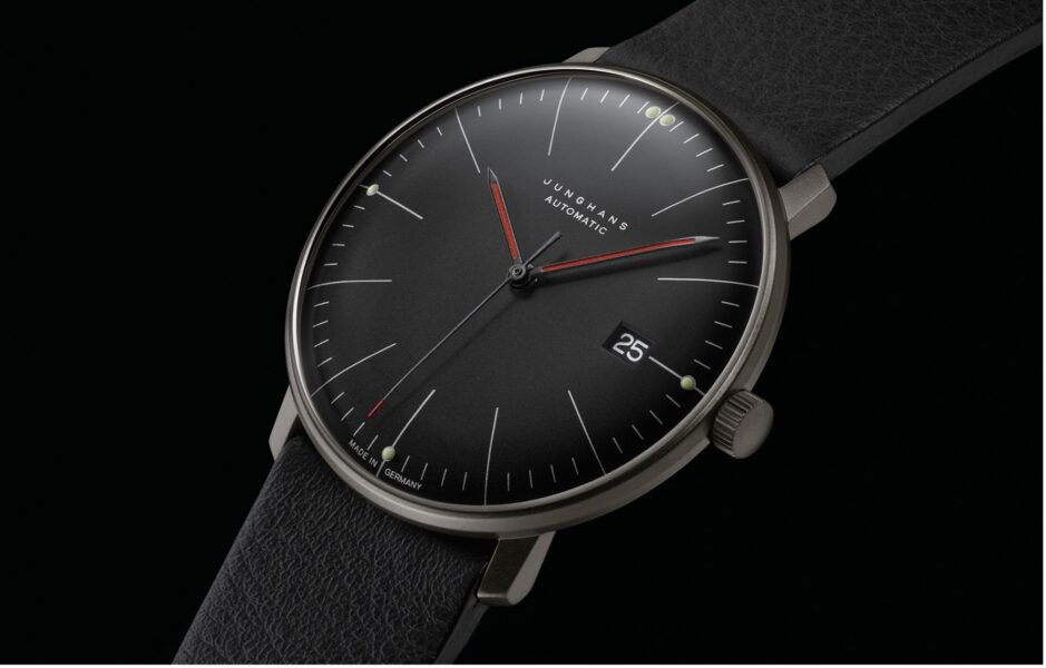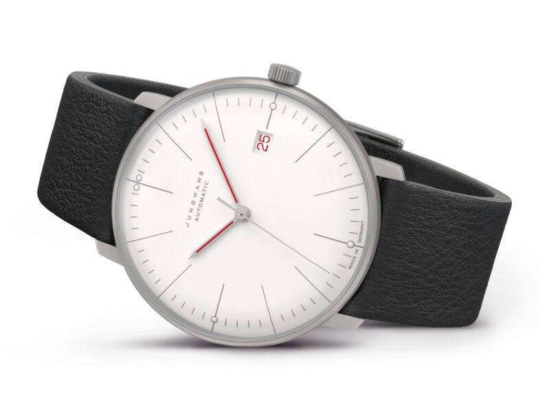 Besonders puristisch zeigt sich die max bill Automatic Bauhaus. Hier ist die Anzeige auf das unbedingt Notwendige und Nützliche reduziert, nämlich eine Zeitanzeige mit Stunden, Minuten und einer zentralen Sekunde sowie ein Datumsfenster. Mit der max bill Automatic Bauhaus ganz in Schwarz interpretiert Junghans diesen Klassiker in einem neuen, modernen Look ohne die klare, gestalterische Grundidee des Bauhaus-Schülers anzutasten.