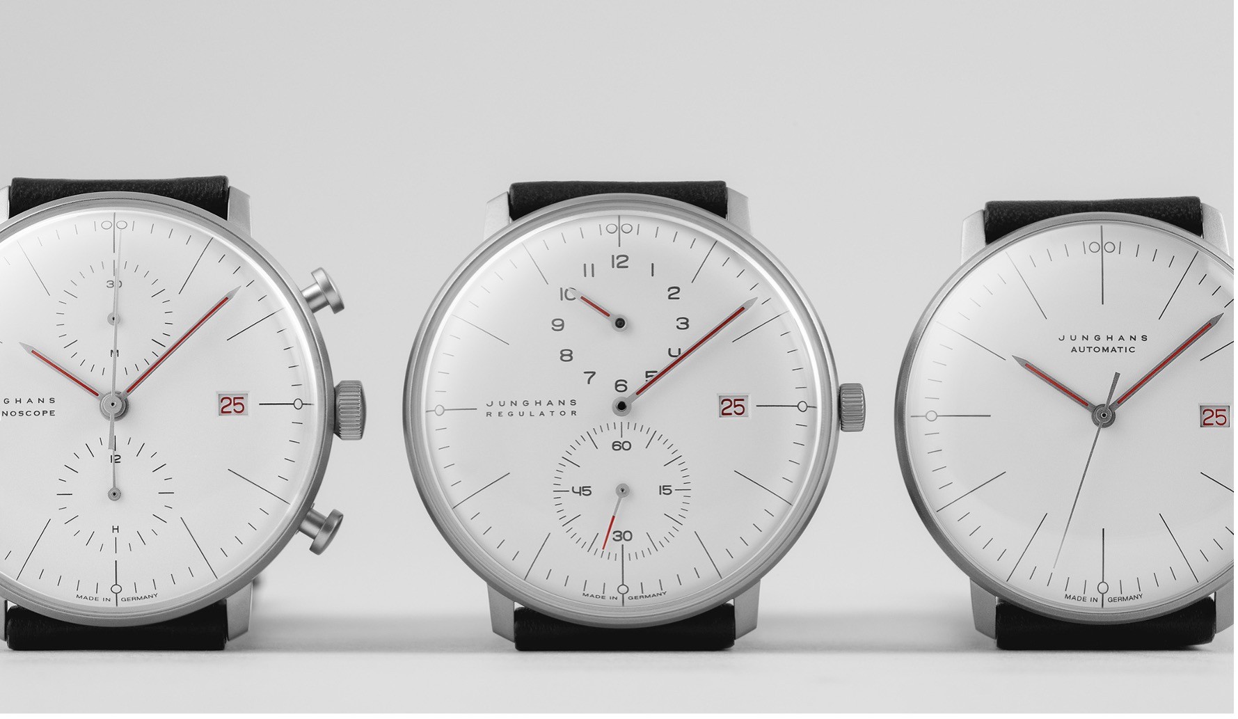 v.l.n.r.: max bill Chronoscope Bauhaus, max bill Regulator Bauhaus, max bill Automatic Bauhaus