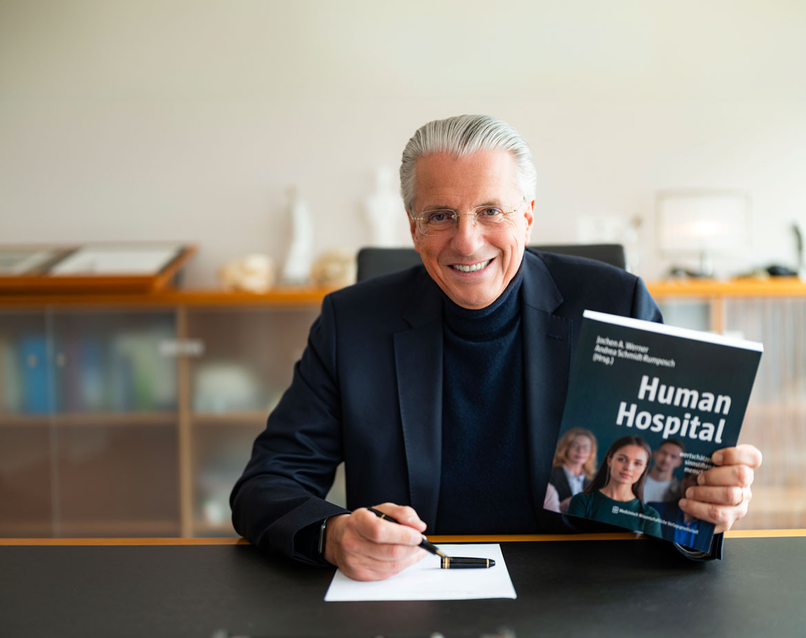 Titelbild: Prof. Dr. Jochen A. Werner legt im Juni mit Human Hospital sein drittes Buch über eine menschenorientierte, zukunftsfähige Krankenversorgung vor. Mitherausgeberin ist die Pflegedirektorin und Vorstandskollegin Andrea Schmidt-Rumposch.