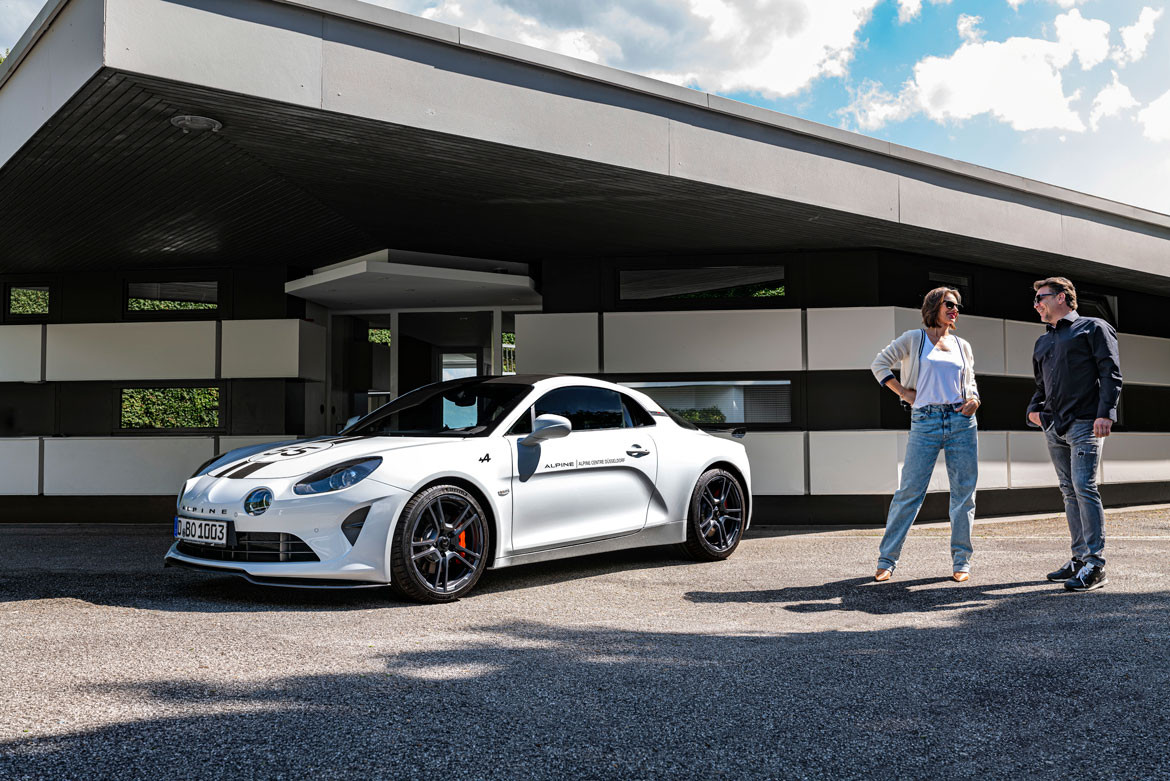 In langgezogenen Kurven spüre ich das Mehr an Anpressdruck durch das Aerodynamik-Paket, was die mögliche Kurvengeschwindigkeit erhöht. Nun weiter auf die Autobahn, um den Effekt bei höheren Geschwindigkeiten zu testen. Die Fahrt bis zum Zielgebiet ruft nach einem V-max-Test. Bis 240 km/h drückt die Alpine ohne Unterlass nach vorne, dann eine langgezogene Rechtskurve, durch die ich ohne langsamer werden zu müssen, mit ihr ziehen kann. Auf der anschließenden Geraden muss ich bei 260 km/h ordentlich in die Eisen treten, da ein Pkw nach links zieht. In Kombination des geringen Gewichts mit den top Brembo-Bremsen bin ich schnell wieder runter auf 140 km/h. Die 275 km/h konnte ich nicht ganz testen, bin aber sicher, dass die V-max möglich gewesen wäre. Ich mache mich auf den Rückweg, denn ich bin noch auf einen Kaffee mit einer Bekannten, Dany Michalski, einer der wenigen Damen, die motorsportinteressiert sind, verabredet. Ich stelle das Renngefährt in White and Black mitten auf den Hof.