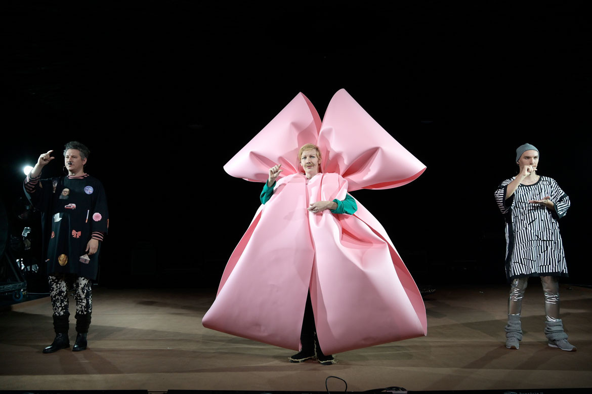 Titelbild: Anspruchsvolle seltene Kost: In Hydra zitiert Sandra Hüller in Bochum Texte des Dramatikers und Lyrikers Heiner Müller. Mit billigen Schnurrbärten und einer Monster-Schleife wird das Verkleiden verlacht.